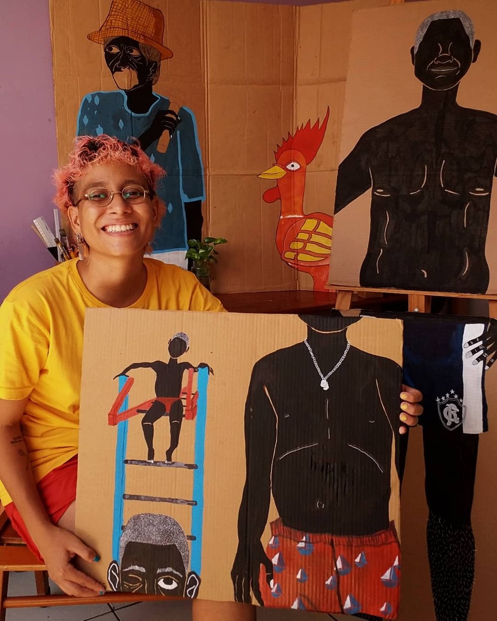 Sobre as obras, ela relata que fazem parte do processo de experimentação que tem feito desde 2020. Uma das peças é sobre o tio, Mário Puska, que é mestre de carimbó em Curuçá, município do nordeste do Pará, distante 139 quilômetros de Belém. Outra, traz o avô, Sérgio Moraes, que foi jogador do clube do Remo. Também há uma obra sobre o primo, Milton Jaime, que, segundo ela, já foi vítima de racismo.