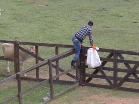 "Olha como ela tá na porta, como é que eu vou passar?" falou Rico tentando justificar a ação. Aos risos, Gui Araujo distraiu a vaca enquanto Rico passava para o outro lado da cerca.