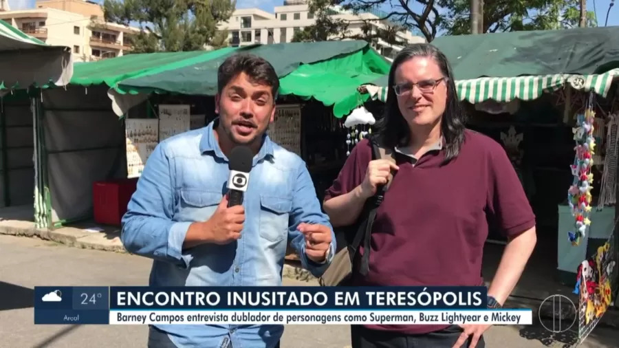 O repórter Barney Campos, do RJTV, estava fazendo uma reportagem ao vivo na Feirinha do Alto em Teresópolis (RJ) quando encontrou um dos nomes mais famosos da dublagem nacional: Guilherme Briggs, a voz brasileira do Super-Homem e de Buzz Lightyear. Mas ele não percebeu quem era!