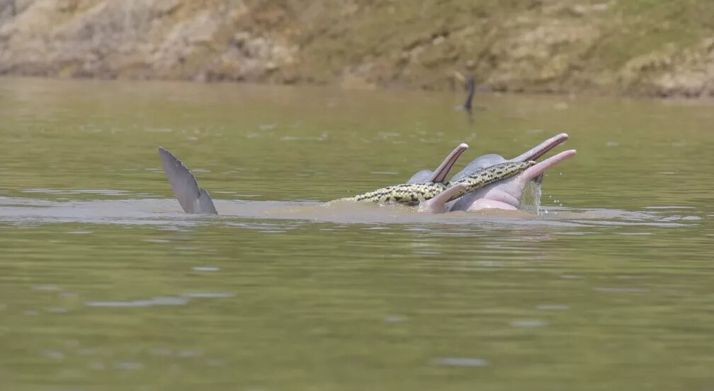 Foto registra interação de botos com anaconda na Bolívia: 'brincadeira', diz pesquisador da UFRGS