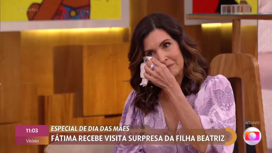 Fátima Bernardes se emocionou no "Encontro" (TV Globo) de hoje. A apresentadora recebeu uma surpresa da filha Beatriz, 24, que chegou no estúdio com um buquê de flores e um cartão.