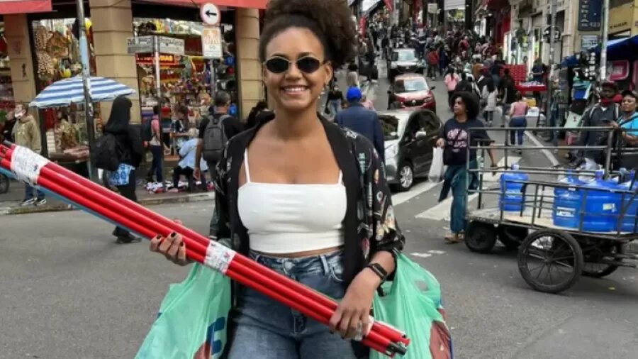 "Sumida pois estava no rolê de compras para o novo lar na 25 de Março! Bem baratinho", ressaltou a professora de biologia, carregada de sacolas.