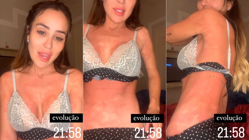 “Vou mostrar como é que está a evolução [das manchas]... Bem forte nas costas. A perna também está forte, tem bastante. Hoje apareceram mais no braço”, começou ela, citando o psiquiatra e escritor Augusto Cury.