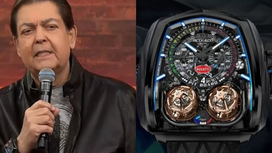 O apresentador Faustão, de 72 anos, chamou atenção ao usar um relógio de US$ 580 mil dólares, na cotação atual cerca de R$ 3 milhões, da sua coleção. O acessório é o Twin Turbo Furious Bugatti, da joaleria Jacob & Co, em homenagem ao aniversário de 110 anos da fabricante de automóveis francesa.