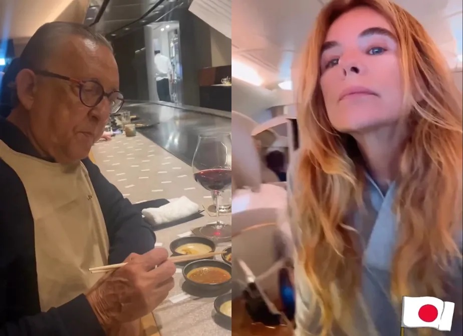 A mulher do comentarista esportivo mostrou desde o voo, na companhia aérea Emirates, a até mesmo a chegada em Tóquio. O casal começou a viagem com uma experiência culinária no restaurante Seryna Mon Cher Tonton.
